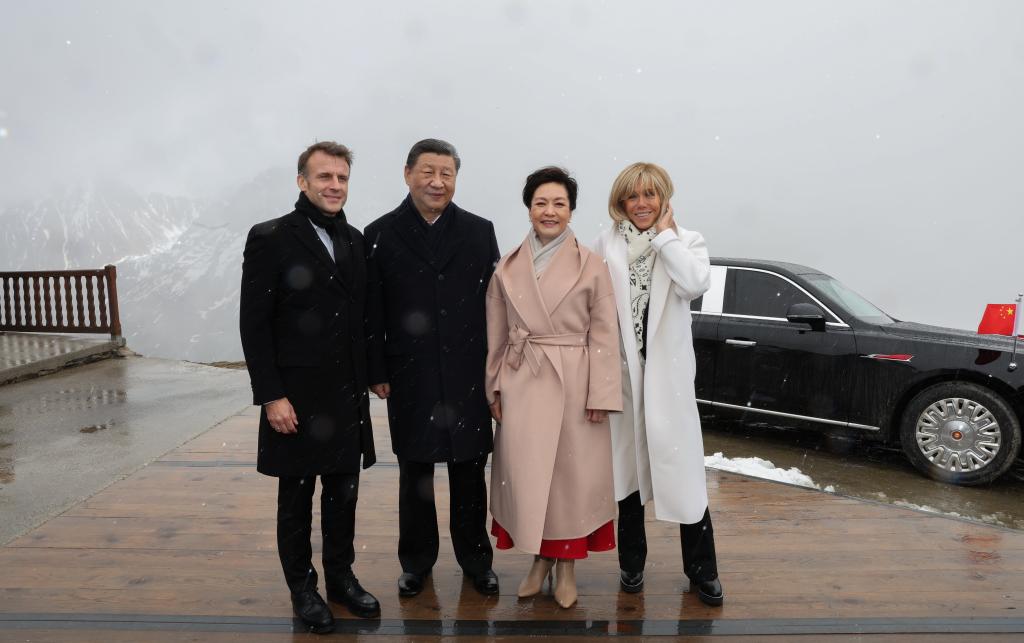 TARBES, France, May 7 (Xinhua) -- Amid falling snows in the picturesque mountains in Hautes-Pyrenees Department in southwestern France, Chinese President Xi Jinping and his wife Peng Liyuan were warmly received by French President Emmanuel Macron and his wife Brigitte Macron on Tuesday at a mountain restaurant for a restricted meeting.