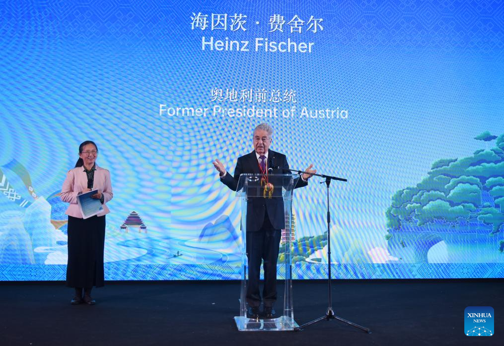 Former Austrian President Heinz Fischer (R) speaks during a Guangxi culture and tourism promotion event in Vienna, Austria, on May 7, 2024. (Xinhua/He Canling)