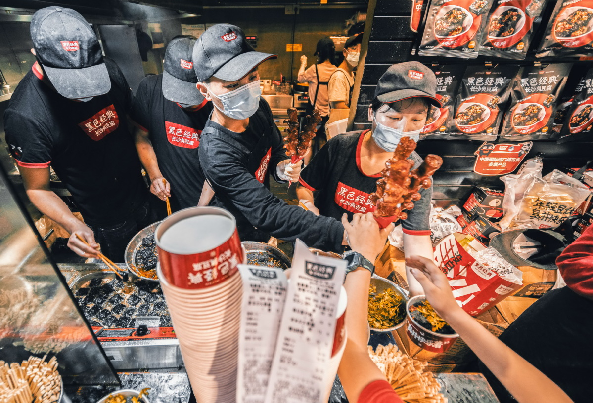 At Huangxing South Road pedestrian street, a bustling commercial section of Changsha's Tianxin district, 19-year-old Luo Cuiti bought a bowl of stinky tofu from a Hey Hey Black shop recently.