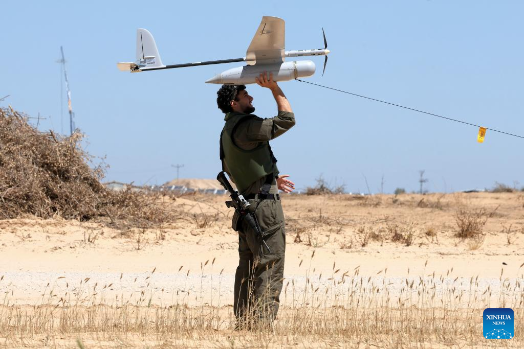 An Israeli soldier prepares to launch an unmanned aerial vehicle near the Kerem Shalom crossing in southern Israel, on May 8, 2024. Israel's army announced on Wednesday that it was continuing its ground assault on Gaza's Rafah, reporting approximately 30 casualties since the offensive began on Monday night. According to an army statement, the 30 casualties were militants, while Gaza health officials reported about 35 deaths, including a four-month-old baby. (Ilan Assayag/JINI via Xinhua)