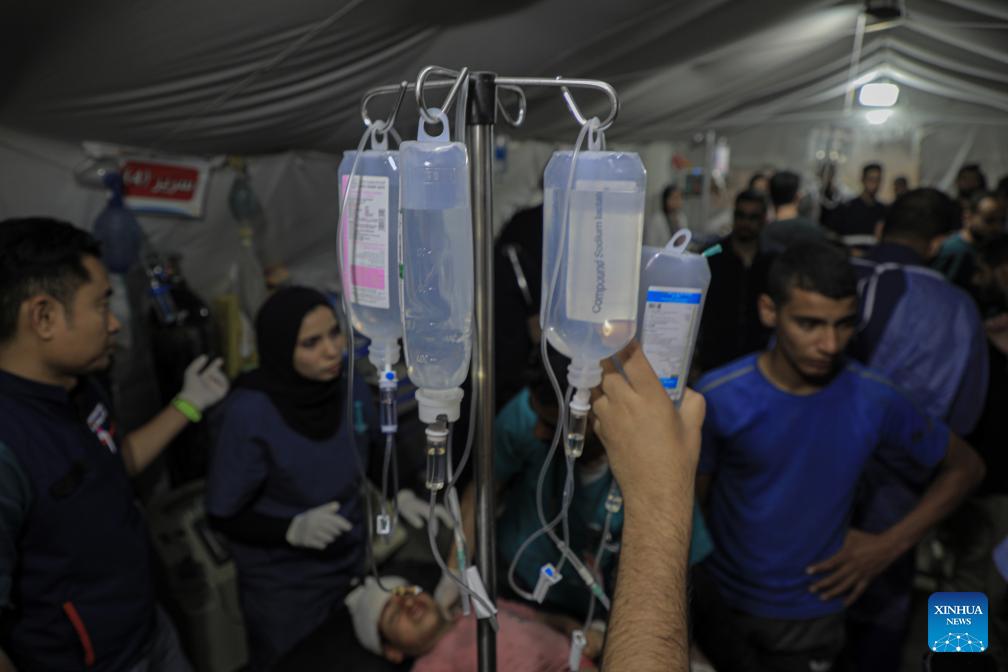 An injured man is treated at a temporary clinic in the southern Gaza Strip city of Rafah, on May 8, 2024. Israel's army announced on Wednesday that it was continuing its ground assault on Gaza's Rafah, reporting approximately 30 casualties since the offensive began on Monday night. According to an army statement, the 30 casualties were militants, while Gaza health officials reported about 35 deaths, including a four-month-old baby. (Photo by Rizek Abdeljawad/Xinhua)