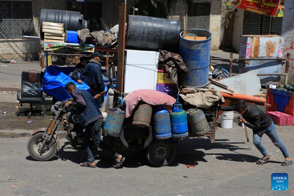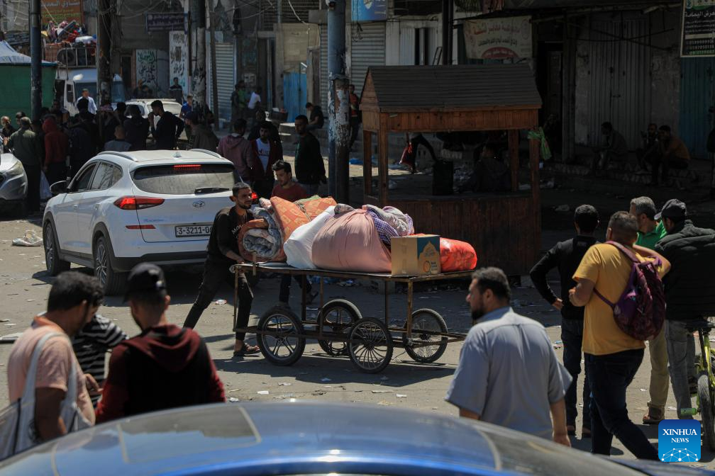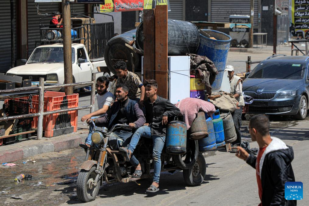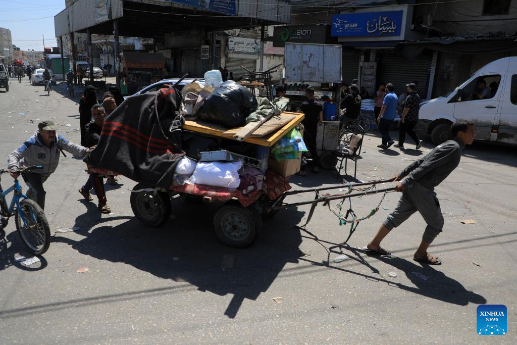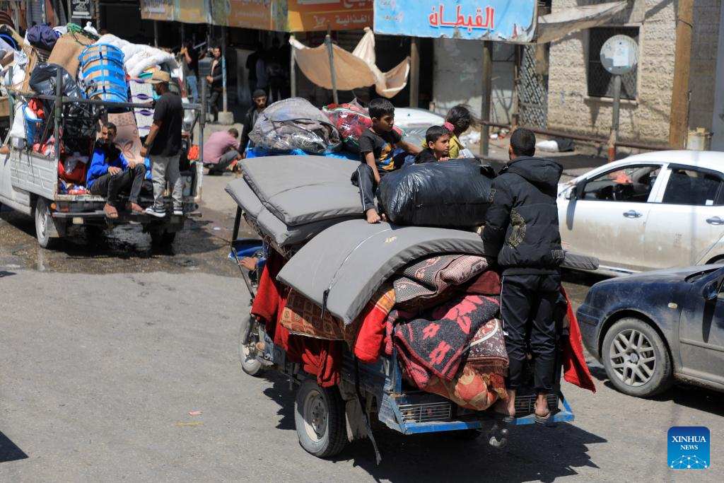 People leave their home in the southern Gaza Strip city of Rafah, on May 8, 2024. Israel's army announced on Wednesday that it was continuing its ground assault on Gaza's Rafah, reporting approximately 30 casualties since the offensive began on Monday night. According to an army statement, the 30 casualties were militants, while Gaza health officials reported about 35 deaths, including a four-month-old baby. (Photo by Rizek Abdeljawad/Xinhua)