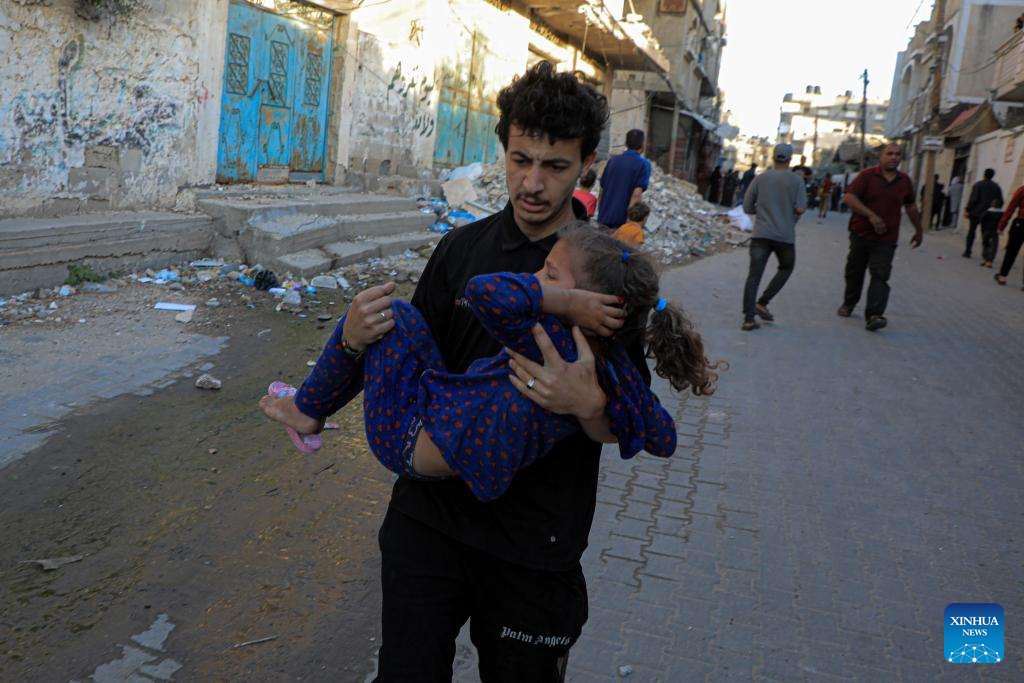 A man carries an injured girl on a street in the southern Gaza Strip city of Rafah, on May 8, 2024. Israel's army announced on Wednesday that it was continuing its ground assault on Gaza's Rafah, reporting approximately 30 casualties since the offensive began on Monday night. According to an army statement, the 30 casualties were militants, while Gaza health officials reported about 35 deaths, including a four-month-old baby. (Photo by Rizek Abdeljawad/Xinhua)