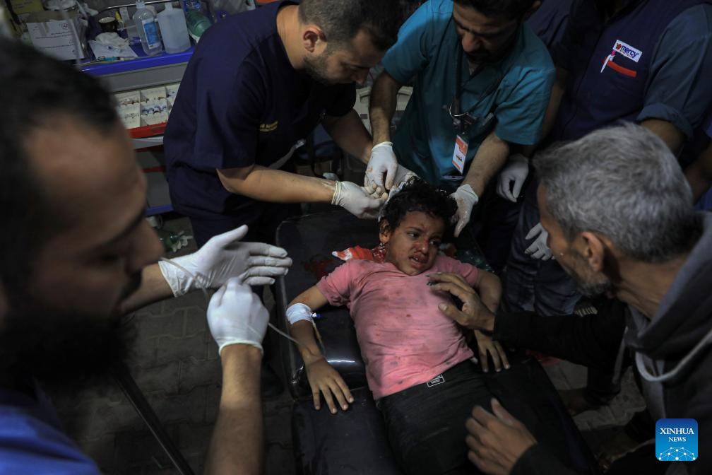 An injured child is treated at a hospital in the southern Gaza Strip city of Rafah, on May 8, 2024. Israel's army announced on Wednesday that it was continuing its ground assault on Gaza's Rafah, reporting approximately 30 casualties since the offensive began on Monday night. According to an army statement, the 30 casualties were militants, while Gaza health officials reported about 35 deaths, including a four-month-old baby. (Photo by Rizek Abdeljawad/Xinhua)