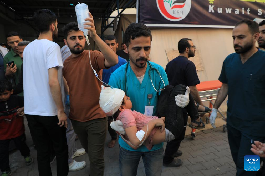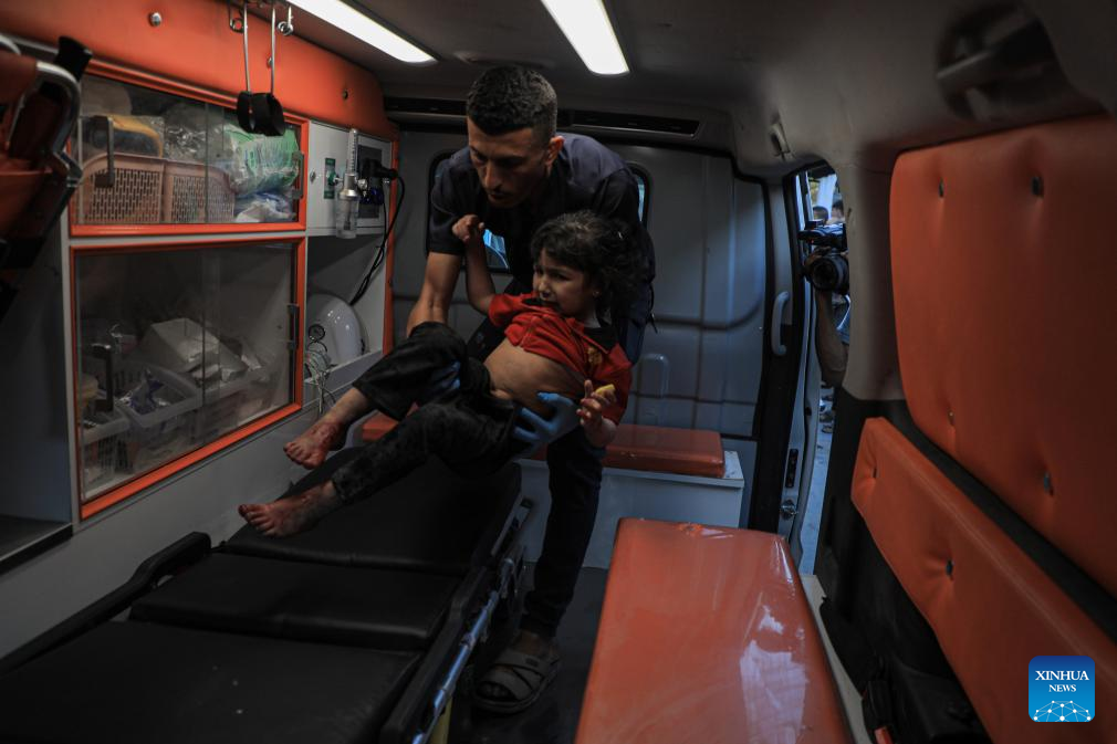 An injured girl is transferred into an ambulance in the southern Gaza Strip city of Rafah, on May 8, 2024. Israel's army announced on Wednesday that it was continuing its ground assault on Gaza's Rafah, reporting approximately 30 casualties since the offensive began on Monday night. According to an army statement, the 30 casualties were militants, while Gaza health officials reported about 35 deaths, including a four-month-old baby. (Photo by Rizek Abdeljawad/Xinhua)