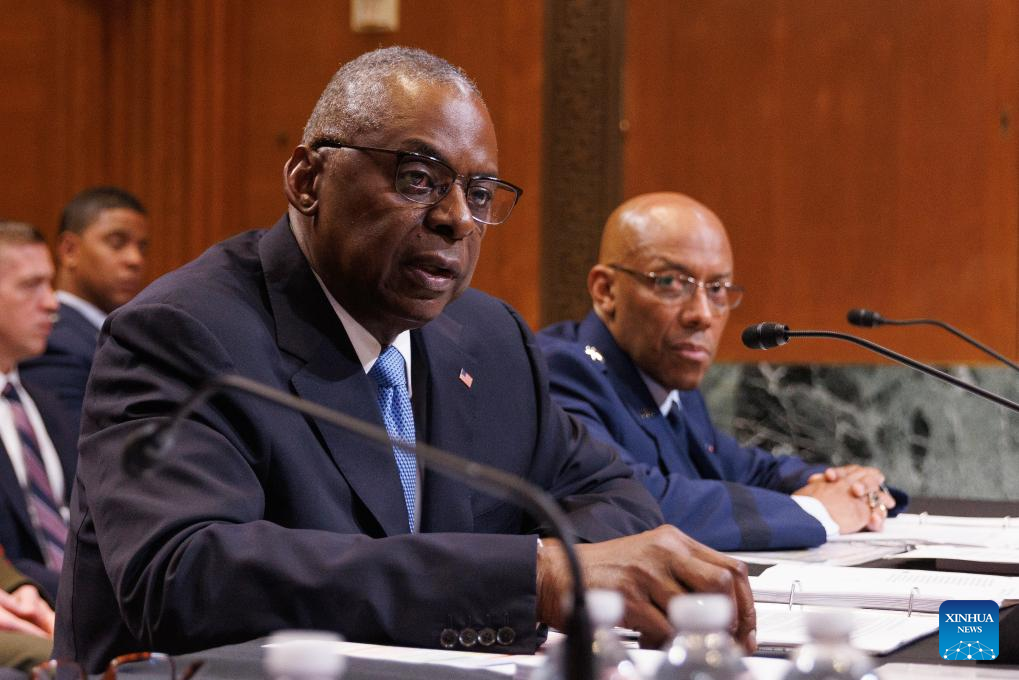 U.S. Defense Secretary Lloyd Austin testifies before the Senate Appropriations Committee Subcommittee on Defense in Washington, D.C., the United States, on May 8, 2024. The United States has withheld one shipment of near-term weapons aid to Israel due to "serious concerns" that a looming large-scale military operation in Rafah by Israeli forces would cause significant loss of civilian lives, the State Department said on Wednesday. Earlier on Wednesday, U.S. Defense Secretary Lloyd Austin told senators on Capitol Hill as he testified on the Pentagon's fiscal year 2025 budget proposal that the Pentagon is "going to continue to do what's necessary to ensure that Israel has the means to defend itself." "But that said, we are currently reviewing some near-term security assistance shipments in the context of unfolding events in Rafah," he added. (Photo by Aaron Schwartz/Xinhua)