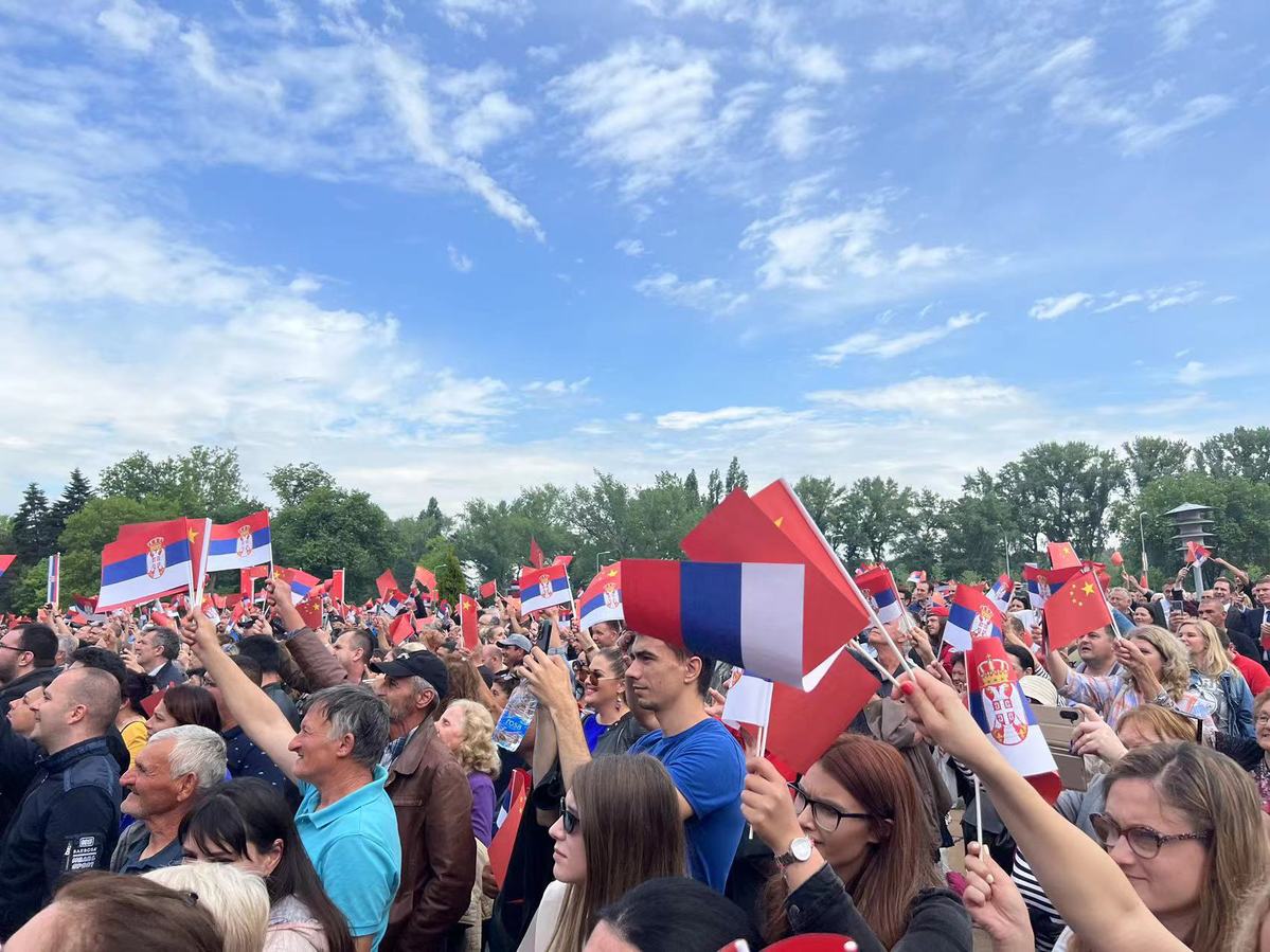 Around 15,000 people wave Chinese and Serbian flags at a Belgrade rally welcoming President Xi on Wednesday. XINHUA
