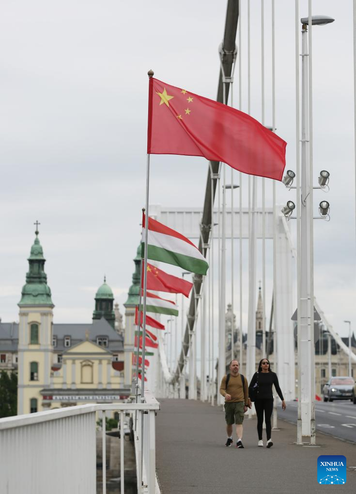 Chinese and Hungarian national flags are seen hoisted in Budapest, Hungary, May 8, 2024. (Xinhua/Zhang Fan)
