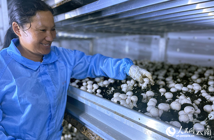 A worker picks Agaricus bisporus at a mushroom cultivation base in Hexi village, Gucheng township, Zhenyuan Yi, Hani, Lahu Autonomous County, Pu'er city, southwest China's Yunnan Province. (People's Daily Online/Cheng Hao)