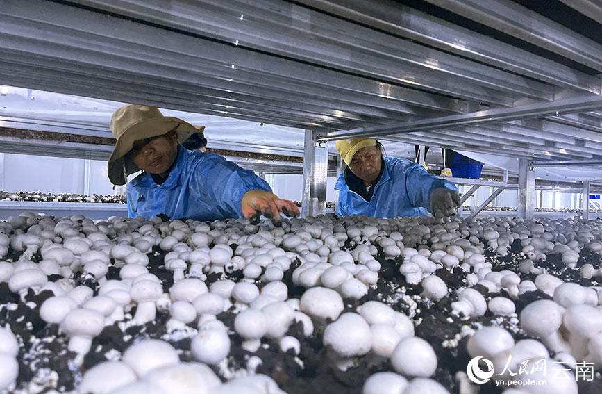 Workers pick Agaricus bisporus at a mushroom cultivation base in Hexi village, Gucheng township, Zhenyuan Yi, Hani, Lahu Autonomous County, Pu'er city, southwest China's Yunnan Province. (People's Daily Online/Cheng Hao)