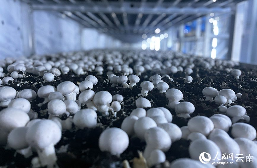 Photo shows Agaricus bisporus at a mushroom cultivation base in Hexi village, Gucheng township, Zhenyuan Yi, Hani, Lahu Autonomous County, Pu'er city, southwest China's Yunnan Province. (People's Daily Online/Cheng Hao)