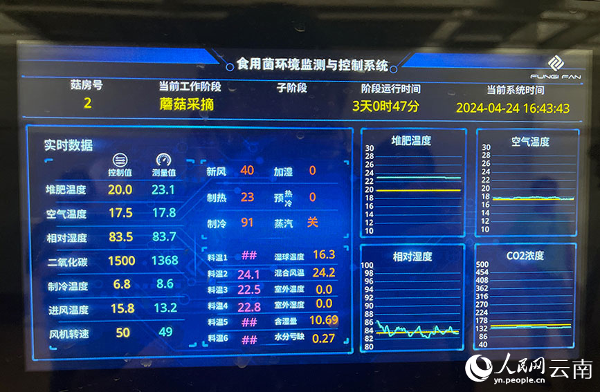 Photo shows a screen on which indicators of the monitor and control system are displayed, at a mushroom cultivation base in Hexi village, Gucheng township, Zhenyuan Yi, Hani, Lahu Autonomous County, Pu'er city, southwest China's Yunnan Province. (People's Daily Online/Cheng Hao)
