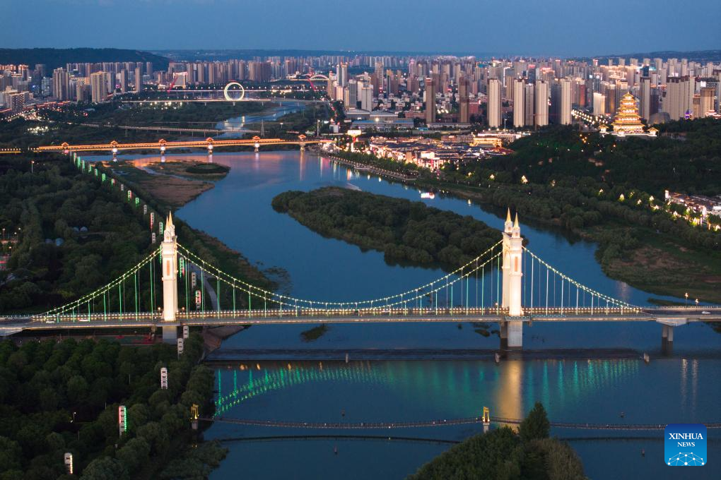 An aerial drone photo taken on May 9, 2024 shows a night view along the Weihe River in Baoji, northwest China's Shaanxi Province. Located at the foot of the Qinling Mountains and along the Weihe River, Baoji of northwest China's Shaanxi Province has continued to make efforts to create a livable urban environment. In recent years, a total of 36 small city parks have been built, providing citizens with activity space for leisure and sports, and improving the ecological environment of the city as well. (Xinhua/Shao Rui)