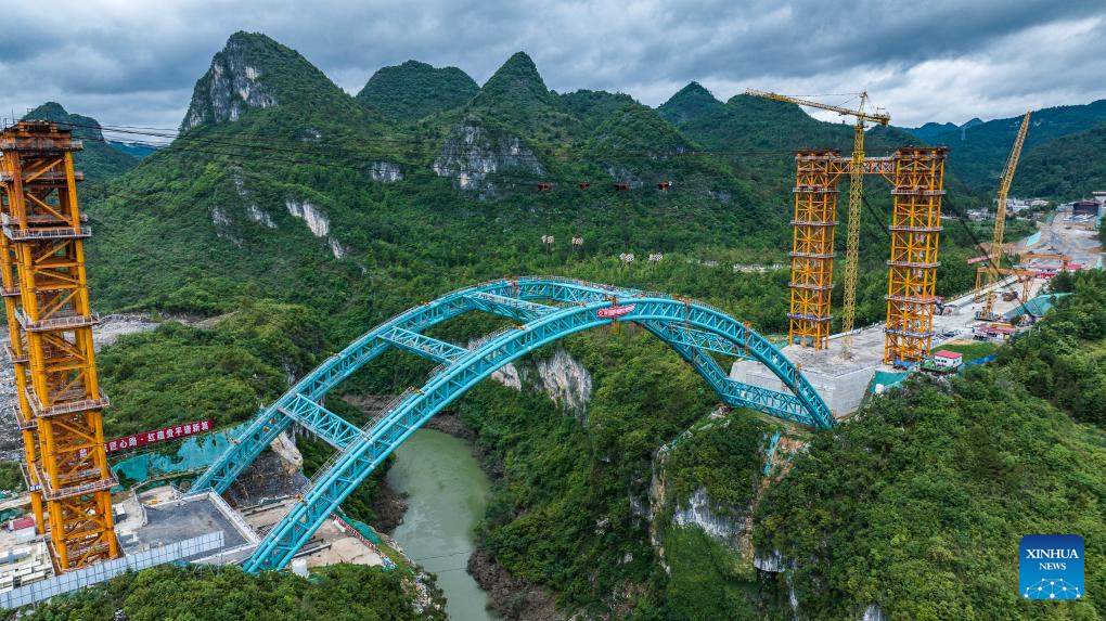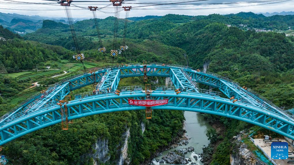 An aerial drone photo taken on May 10, 2024 shows the construction site of the Lami River bridge along the Guiyang-Pingtang expressway in southwest China's Guizhou Province. The bridge, with a total length of 206 meters, saw its arch ribs closed on Friday. (Xinhua/Tao Liang)