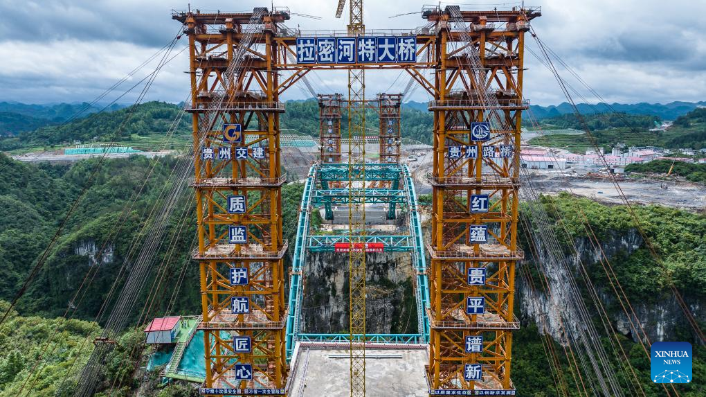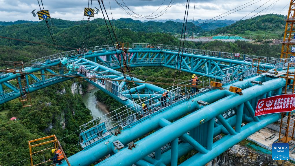 A worker works at the construction site of the Lami River bridge along the Guiyang-Pingtang expressway in southwest China's Guizhou Province, May 10, 2024. The bridge, with a total length of 206 meters, saw its arch ribs closed on Friday. (Xinhua/Tao Liang)