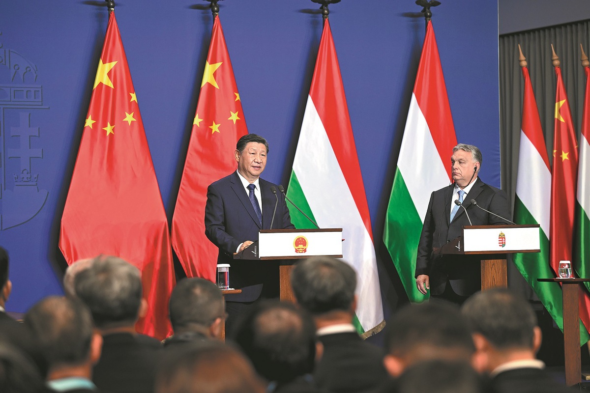 President Xi Jinping speaks during his joint press conference with Hungarian Prime Minister Viktor Orban following their talks in Budapest, Hungary, on Thursday. XIE HUANCHI/XINHUA