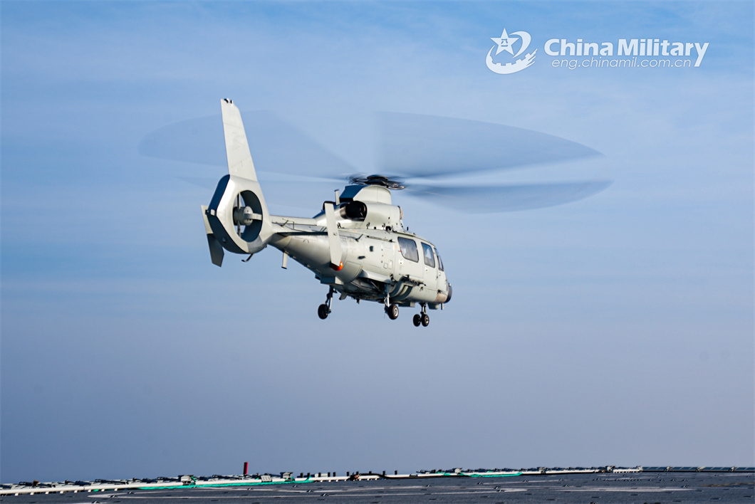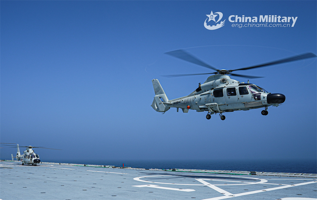 A ship-borne helicopter attached to a ship-borne helicopter regiment with the navy under the PLA Eastern Theater Command lifts off from the flight deck of a landing ship during a coordinated training exercise in mid-April, 2024. (eng.chinamil.com.cn/Photo by Zhou Chunze)
