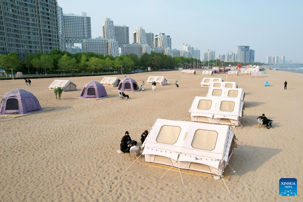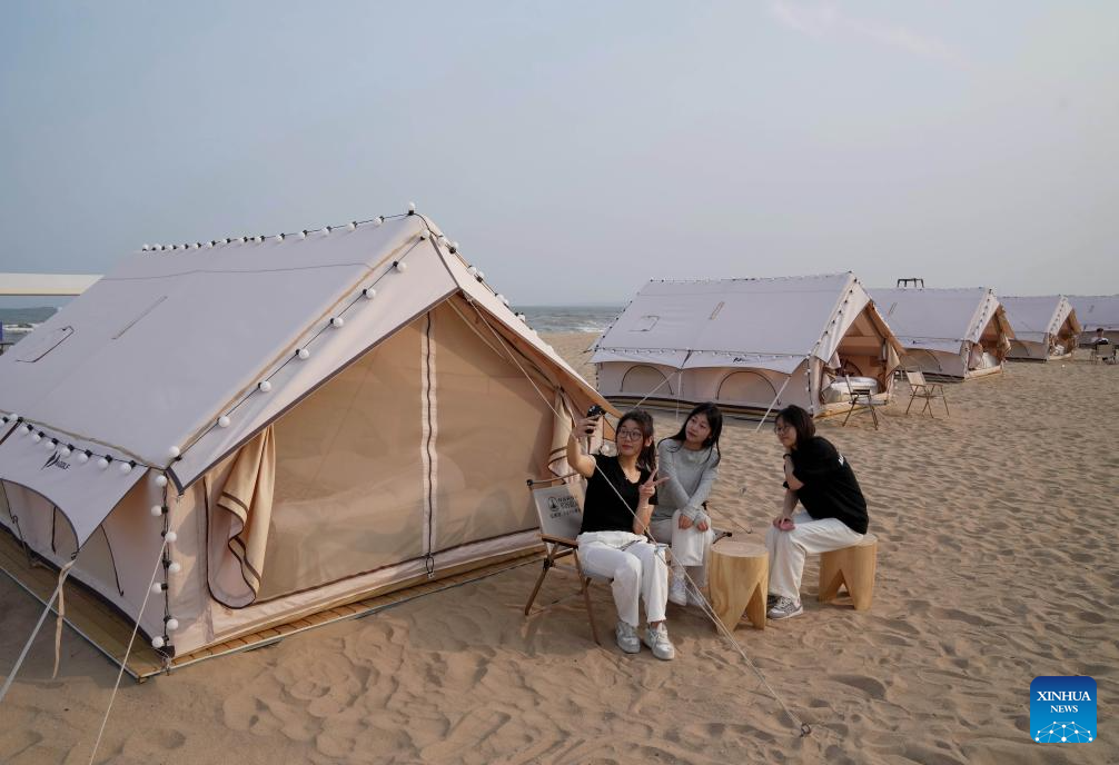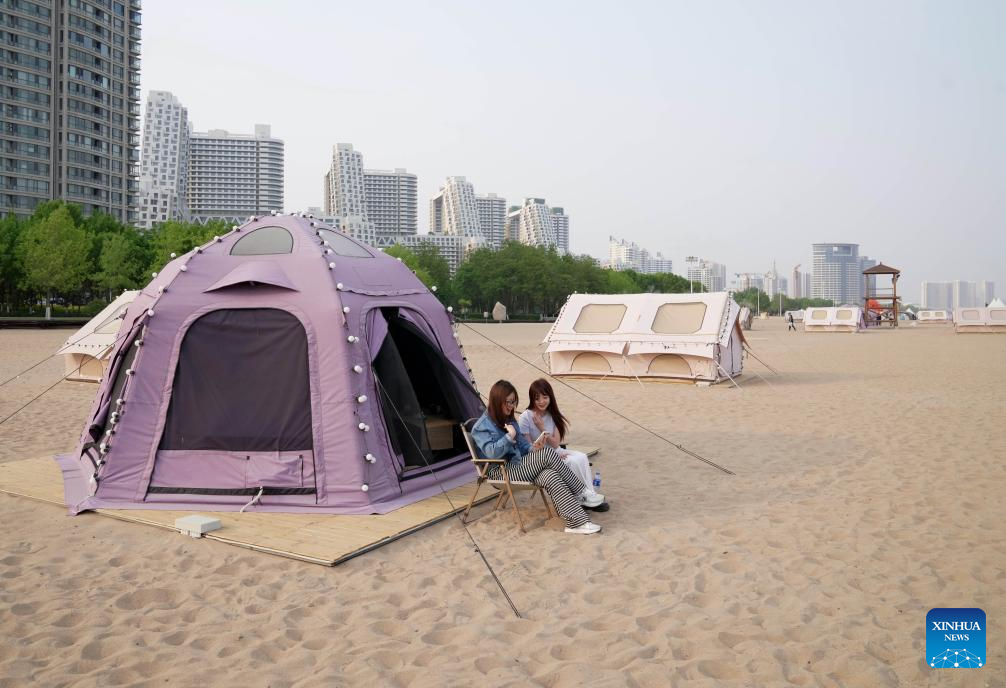 Tourists enjoy themselves by a tent at a camping site of a coastal scenic area in Qinhuangdao, north China's Hebei Province. The newly opened camping attracts tourists to experience the fun of camping. (Xinhua/Yang Shiyao)