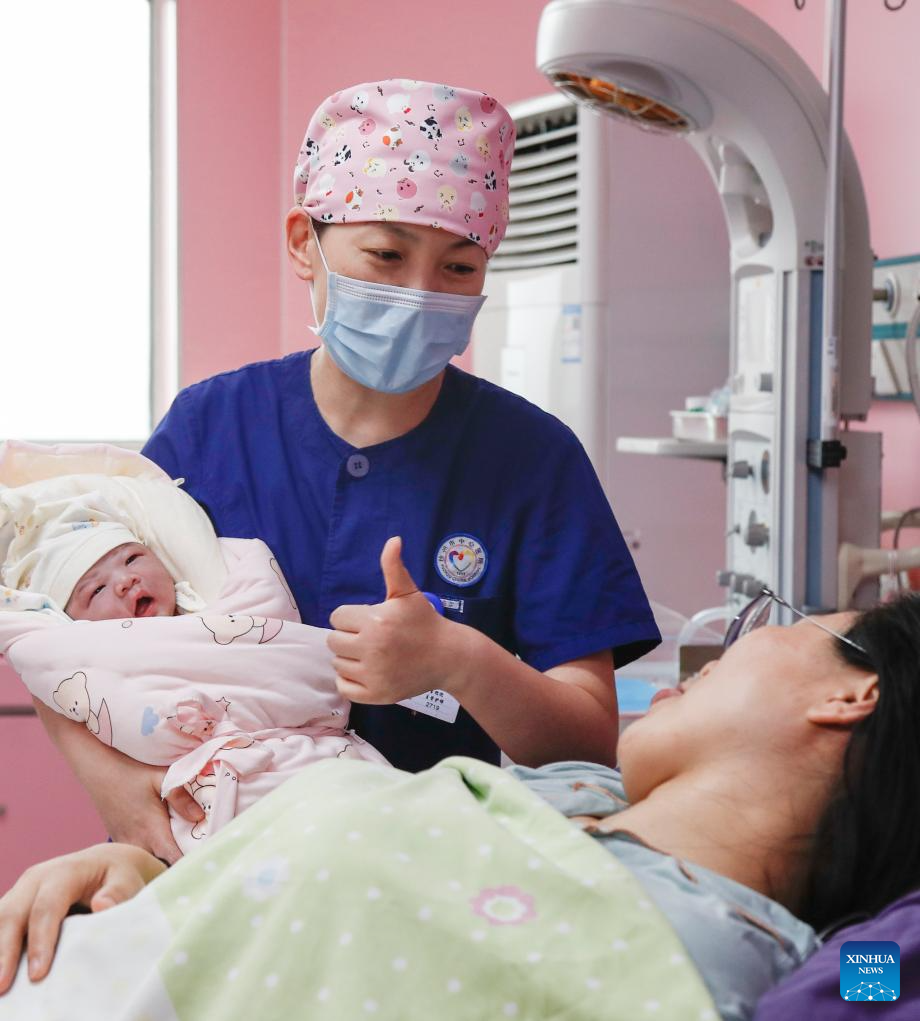A nurse holds a newborn baby and interacts with the mother in a hospital in Xuzhou City, east China's Jiangsu Province, May 12, 2024. Sunday marked the 113th International Nurses Day. (Photo by Bai Xue/Xinhua)