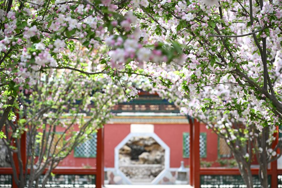 This photo taken on April 7, 2024 shows blooming flowers at the Palace Museum, also known as the Forbidden City, in Beijing, capital of China. (Xinhua/Jin Liangkuai)