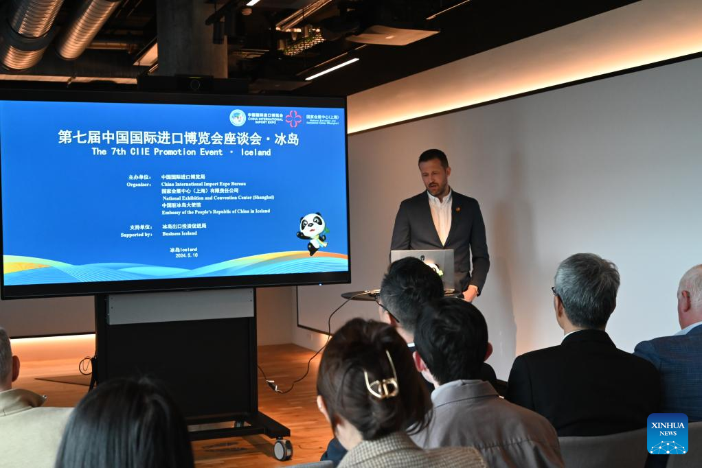 Kristinn Bjornsson, project manager of Business Iceland, speaks during a promotional event for the 7th China International Import Expo(CIIE), in Reykjavik, Iceland, May 10, 2024. A memorandum of cooperation was signed on Friday between Business Iceland and the China International Import Expo Bureau, tapping the potential for a record number of Icelandic companies participating in this year's CIIE. (Xinhua/Chen Jing)