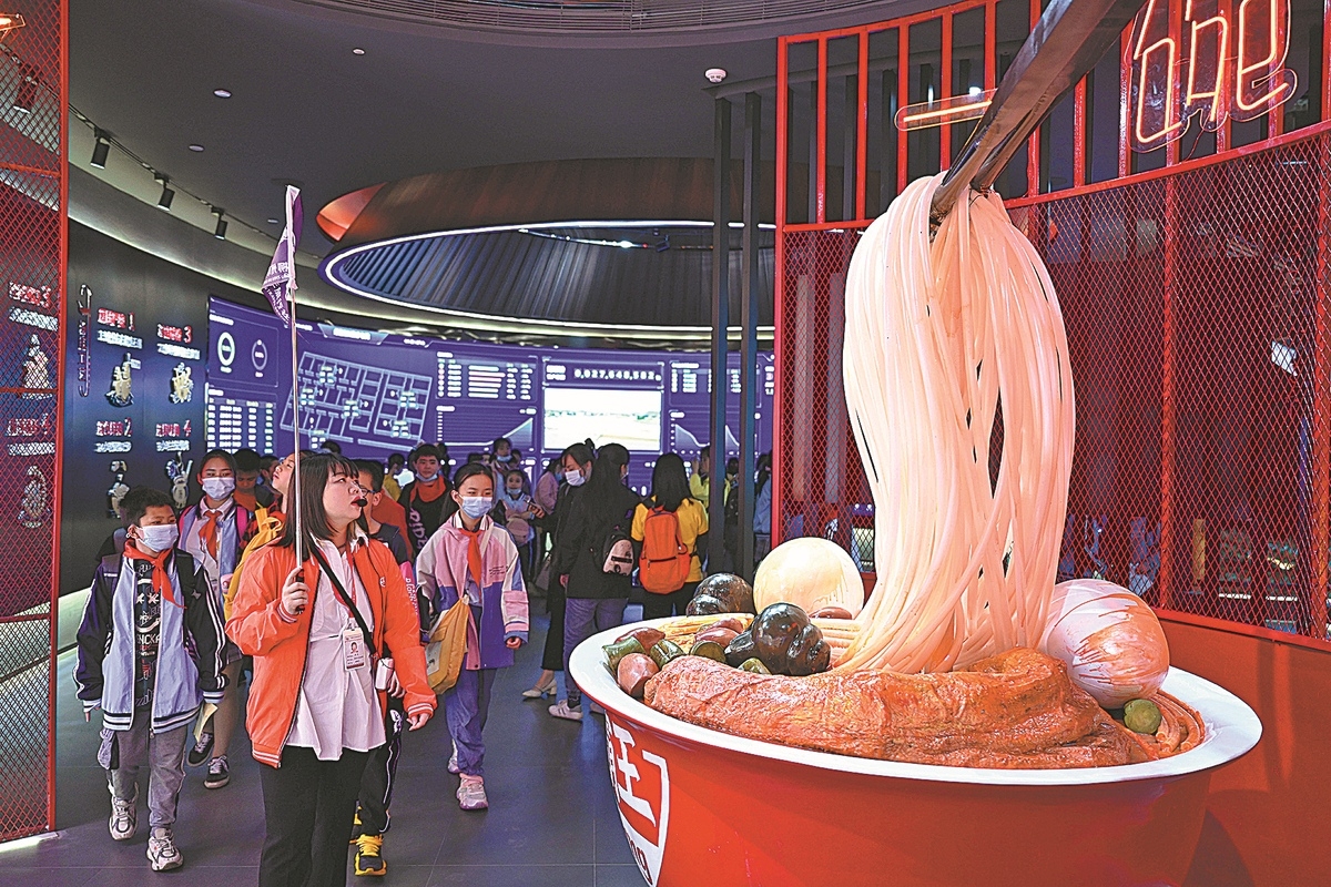 Students visit a company that makes Luosifen at an industrial park in Liuzhou, Guangxi Zhuang Autonomous Region. (China Daily/Li Hanchi)