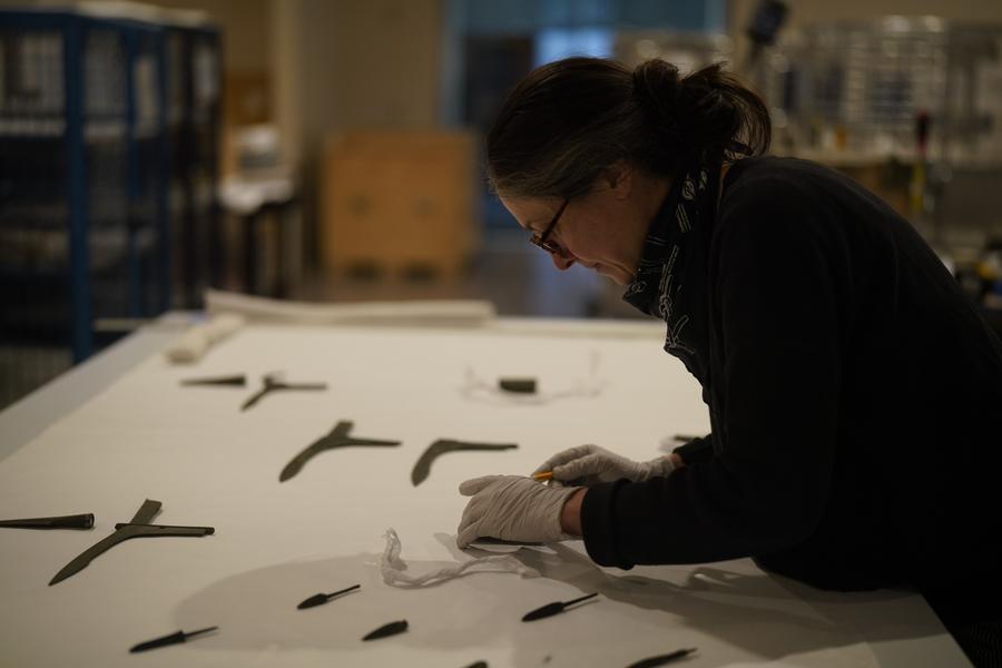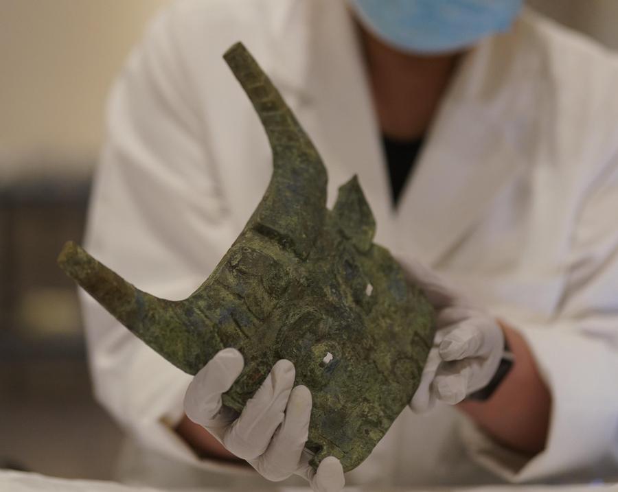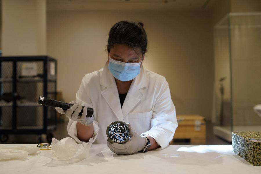 A staff member checks an exhibit for a major exhibition of Chinese cultural relics from China's Bronze Age in San Francisco, California, the United States, March 22, 2024. (Xinhua/Wu Xiaoling)