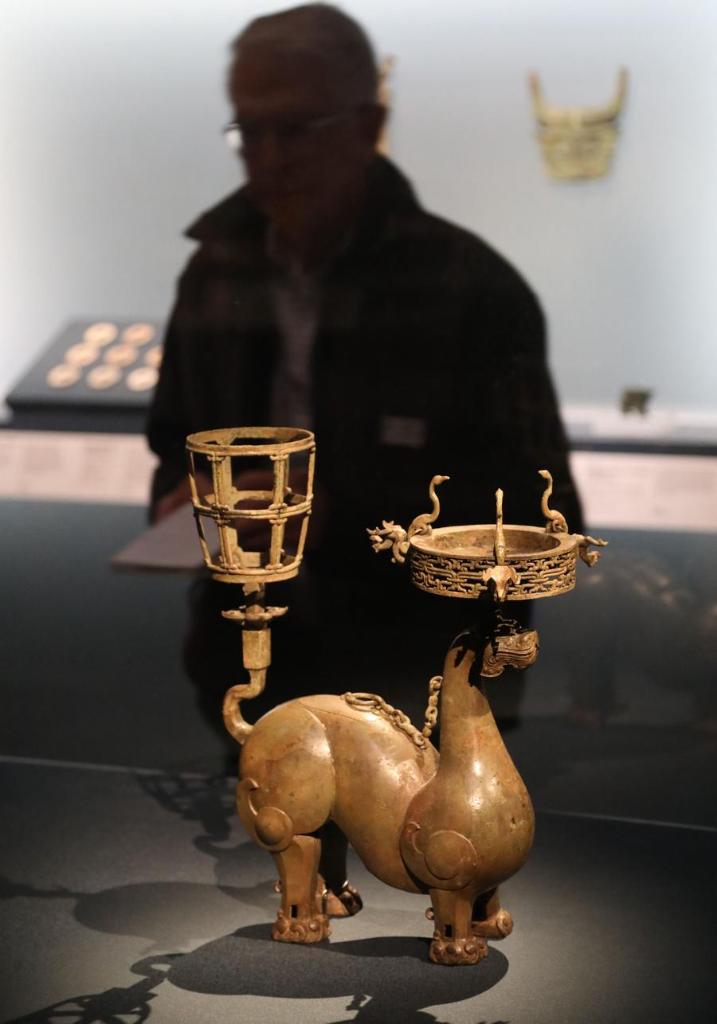 A visitor views an exhibit at a major exhibition of Chinese cultural relics from China's Bronze Age in San Francisco, California, the United States, April 19, 2024. (Photo by Liu Yilin/Xinhua)