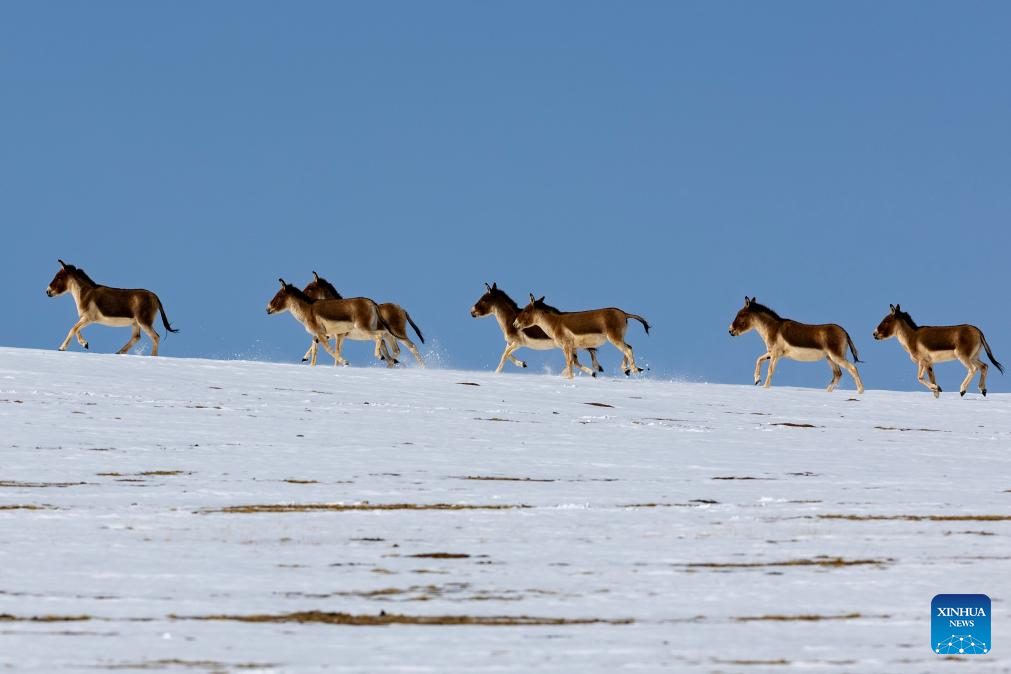 This photo taken on May 9, 2024 shows Tibetan wild donkeys at the Changtang National Nature Reserve in Nyima County of Nagqu City, southwest China's Xizang Autonomous Region. Dubbed the "paradise of wild animals," Changtang National Nature Reserve is home to over 30 kinds of wild animals listed on China's national-level protection catalogue, including Tibetan antelopes and wild yaks. (Xinhua/Tenzin Nyida)