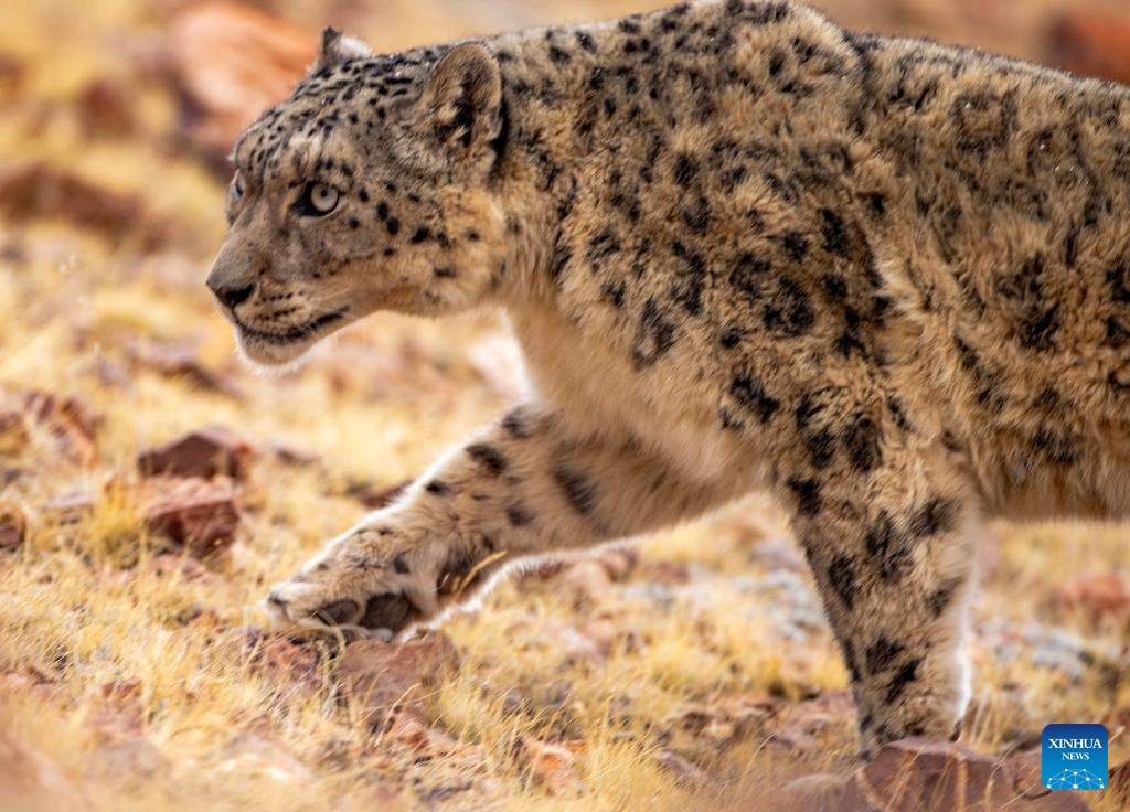 This photo taken on May 7, 2024 shows a snow leopard at the Changtang National Nature Reserve in Nyima County of Nagqu City, southwest China's Xizang Autonomous Region. Dubbed the "paradise of wild animals," Changtang National Nature Reserve is home to over 30 kinds of wild animals listed on China's national-level protection catalogue, including Tibetan antelopes and wild yaks. (Xinhua/Jiang Fan)