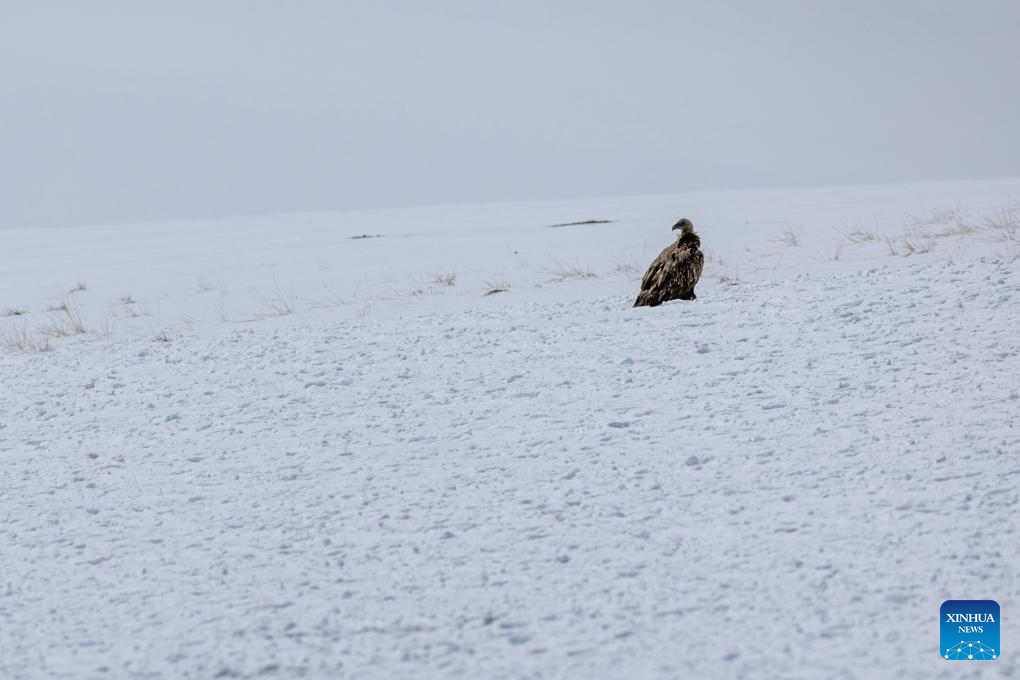 This photo taken on May 9, 2024 shows a Himalayan vulture at the Changtang National Nature Reserve in Nyima County of Nagqu City, southwest China's Xizang Autonomous Region. Dubbed the "paradise of wild animals," Changtang National Nature Reserve is home to over 30 kinds of wild animals listed on China's national-level protection catalogue, including Tibetan antelopes and wild yaks. (Xinhua/Jiang Fan)