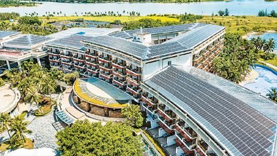 Photo shows a Boao Forum for Asia hotel with photovoltaic curtain walls, which can reduce electrical consumption for air conditioning in its lobby by around 20 percent a year, in Boao township, Qionghai, south China's Hainan Province. (Photo/Zheng Hangcheng)