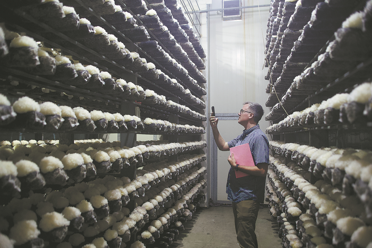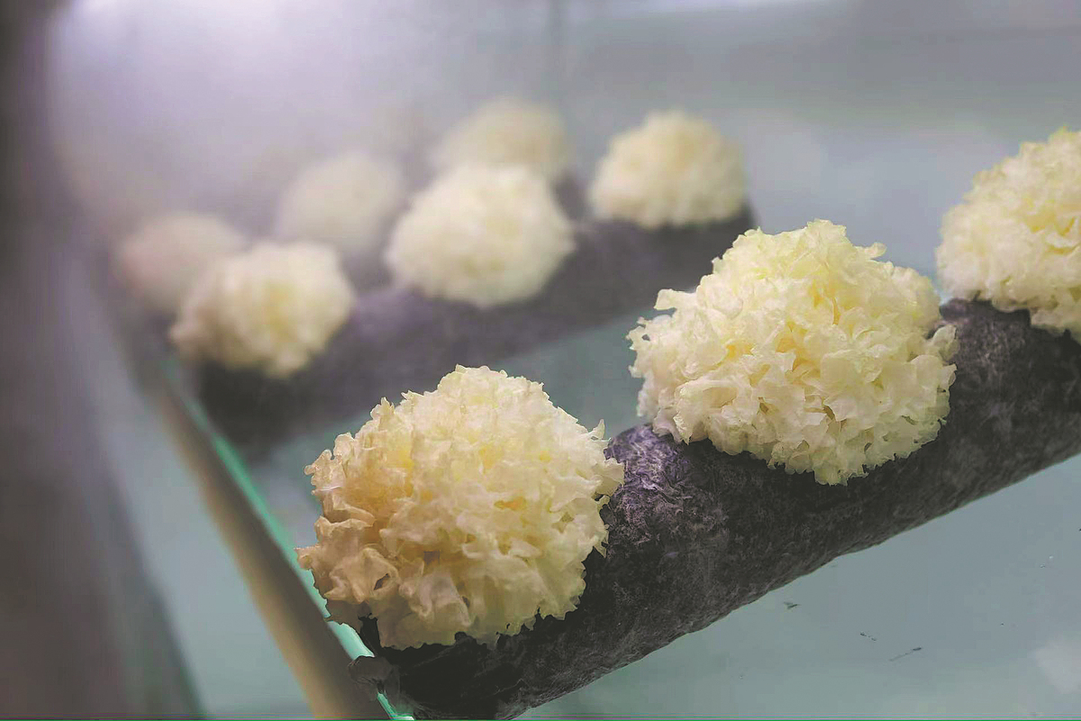 In a smart incubator in Gutian county, Fujian, silver ear fungi grow on cultivation rods made from cottonseed shells. HU MEIDONG/CHINA DAILY