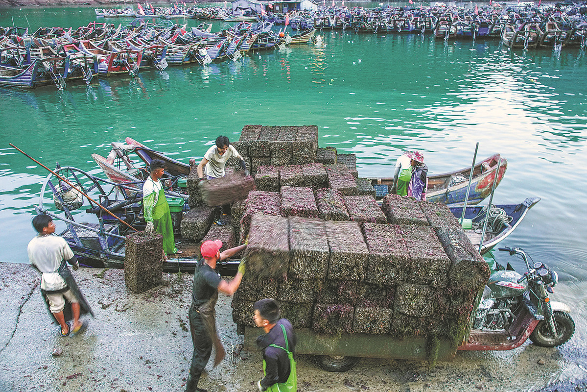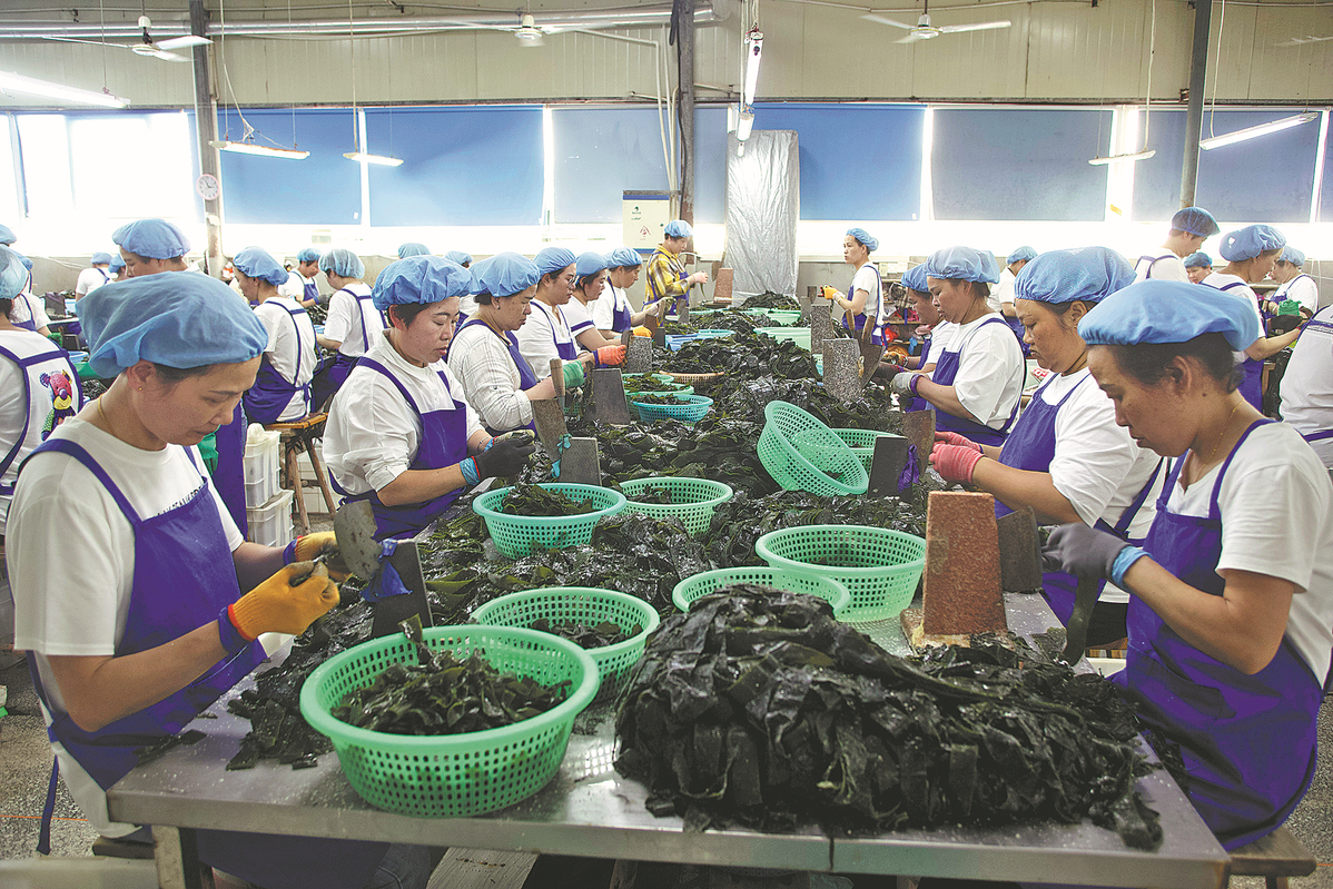 Workers sort kelp for processing at a factory workshop in Ningde in March. HU MEIDONG/CHINA DAILY
