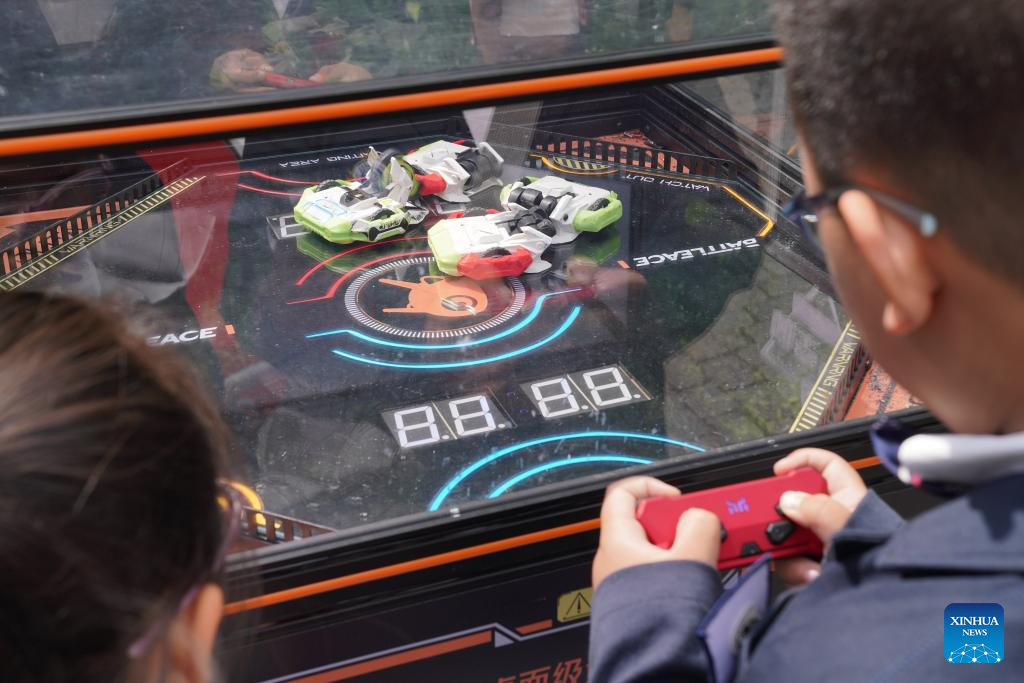A child experiences a robot competition during an exhibition showcasing innovation and entrepreneurship achievements among college students from the Harbin Institute of Technology on the Central Street in Harbin, northeast China's Heilongjiang Province, May 13, 2024. (Xinhua/Wang Song)