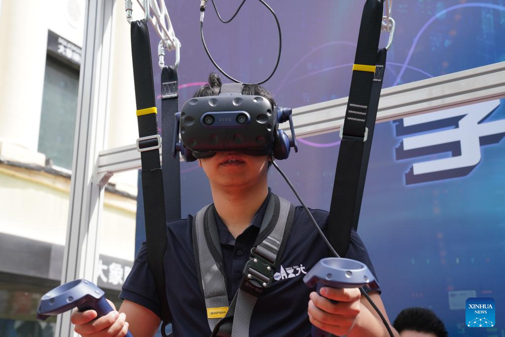 A team member displays an immersive micro-gravity experience system during an exhibition showcasing innovation and entrepreneurship achievements among college students from the Harbin Institute of Technology on the Central Street in Harbin, northeast China's Heilongjiang Province, May 13, 2024. (Xinhua/Wang Song)