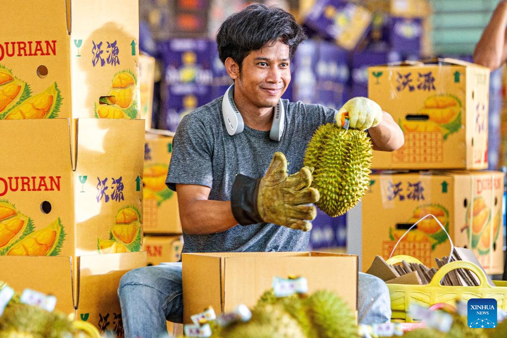 A worker packs durians at a processing factory in Chanthaburi, Thailand, April 26, 2024. Thailand is one of the world's leading producers and exporters of durian, exporting large quantities to China each year. According to data from China's General Administration of Customs, in 2023, China imported 1.426 million tonnes of fresh durian, with 929,000 tonnes coming from Thailand, accounting for 65.15 percent of China's total fresh durian imports. (Xinhua/Wang Teng)