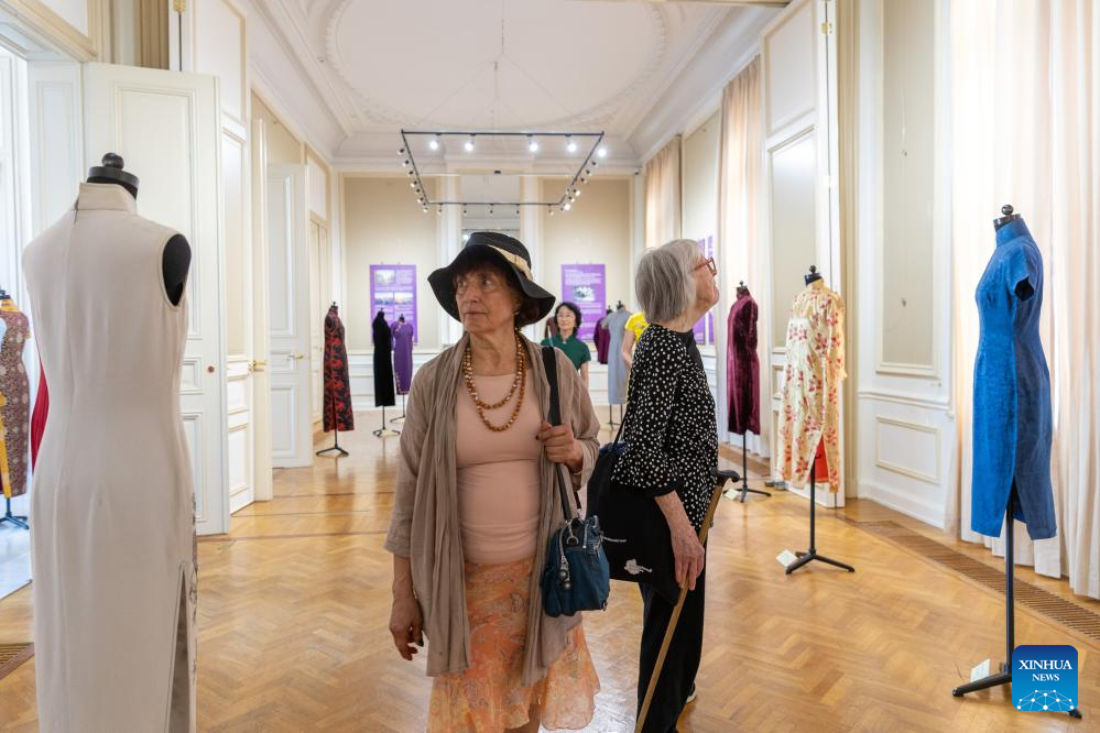 People visit the "Elegance and Style: Qipao and Shanghai Culture" at the China Cultural Center in Brussels, Belgium, on May 13, 2024. (Xinhua/Meng Dingbo)