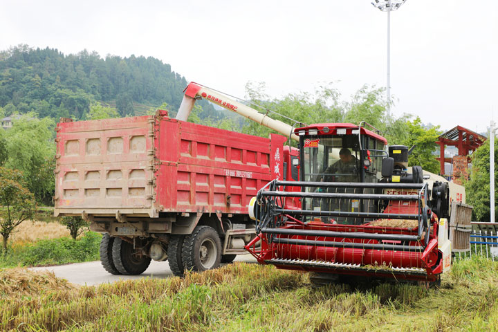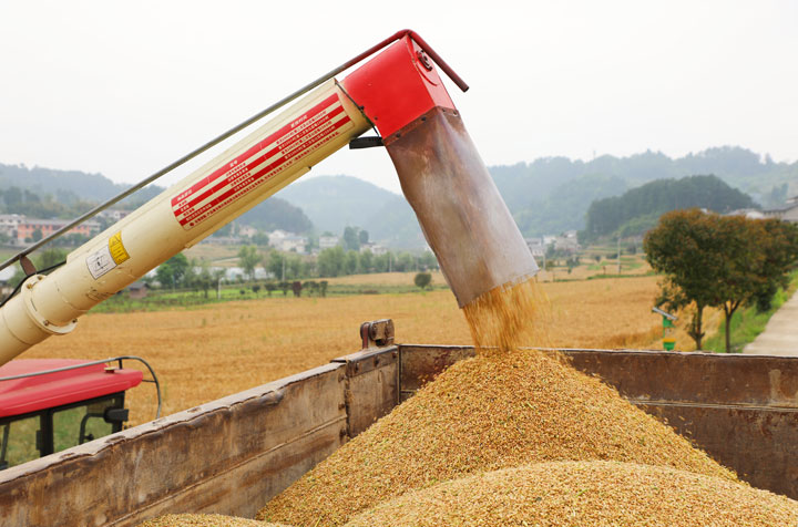 Wheat grains are loaded on a truck in Tongzi county, Zunyi city, southwest China's Guizhou Province. (Photo/Chen Guiliang)