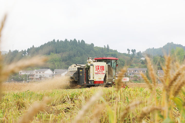 A harvester reaps wheat in a field in Tongzi county, Zunyi city, southwest China's Guizhou Province. (Photo/Chen Guiliang)
