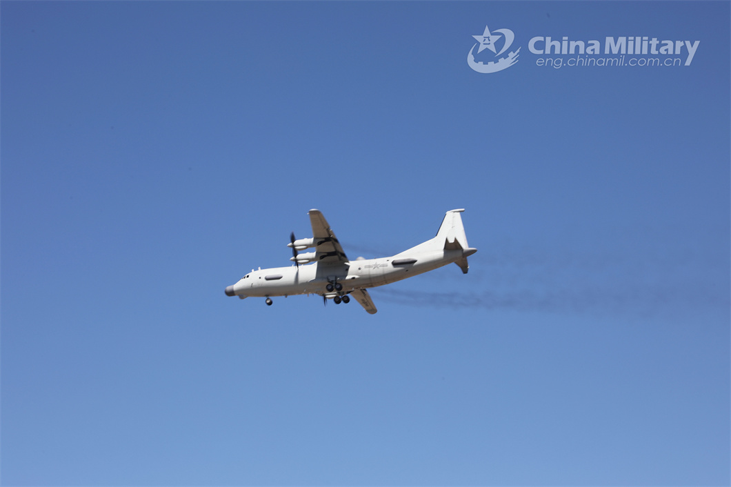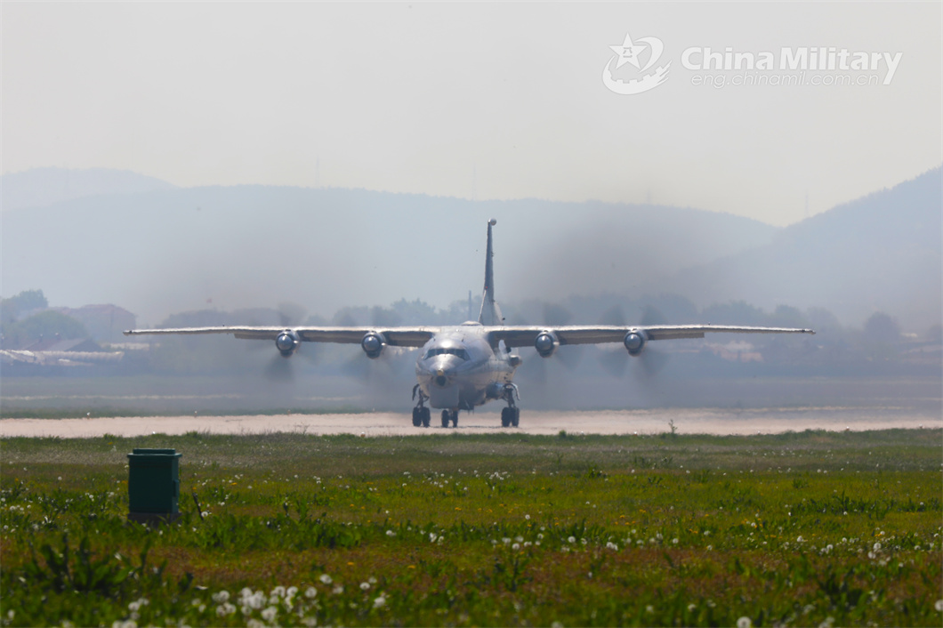 A reconnaissance aircraft attached to a PLA naval aviation unit takes off for a patrol flight training exercise on May 1, 2024. (eng.chinamil.com.cn/Photo by Yang Jian and Xing Yun)