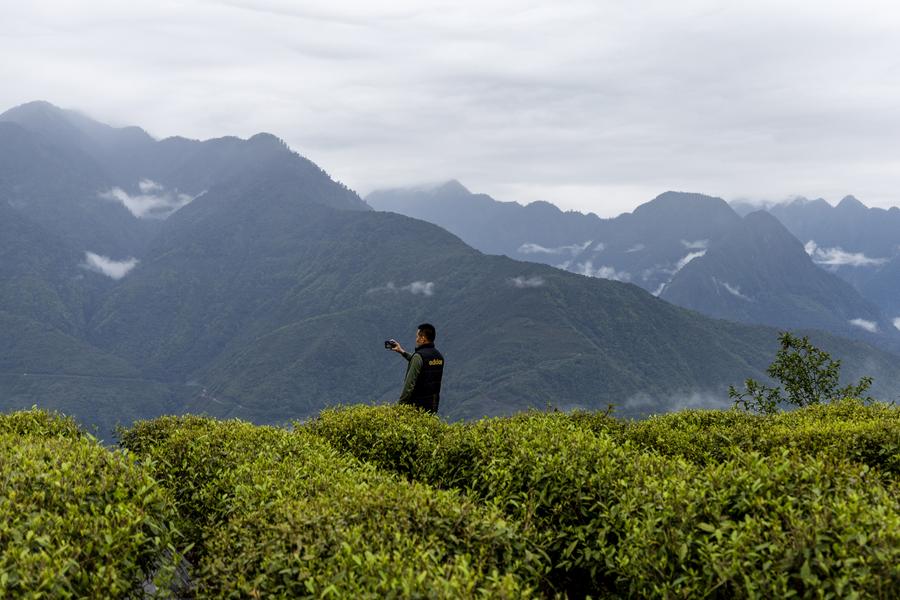 A tourist takes photos at a tea garden in Gelin Village of Medog County, southwest China's Xizang Autonomous Region, April 24, 2024. (Xinhua/Jiang Fan)