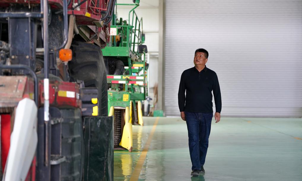 Han Bo checks agricultural machines at a workshop in Shawan City, northwest China's Xinjiang Uygur Autonomous Region, April 18, 2024. (Xinhua/Aman)