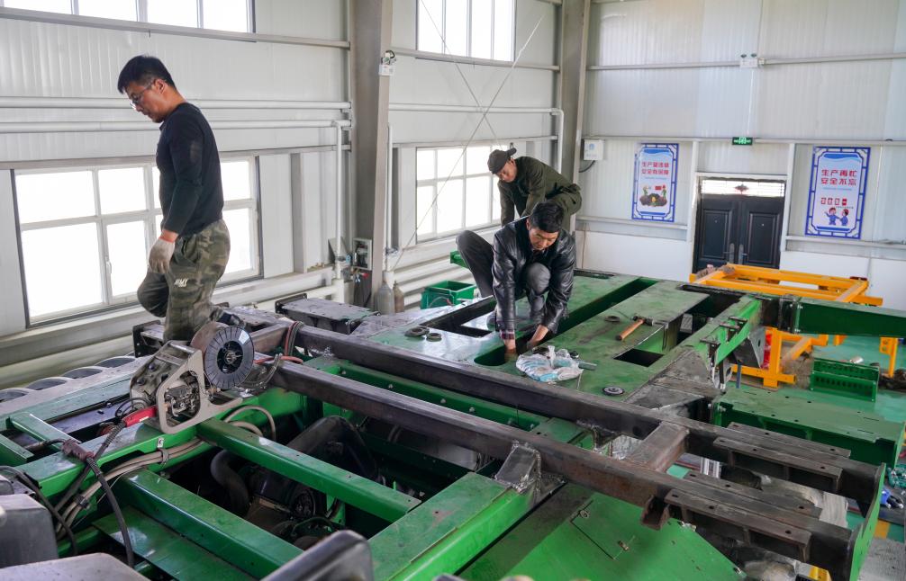 Workers refit agricultural machines at a workshop of Han Bo in Shawan City, northwest China's Xinjiang Uygur Autonomous Region, April 18, 2024. (Xinhua/Aman)