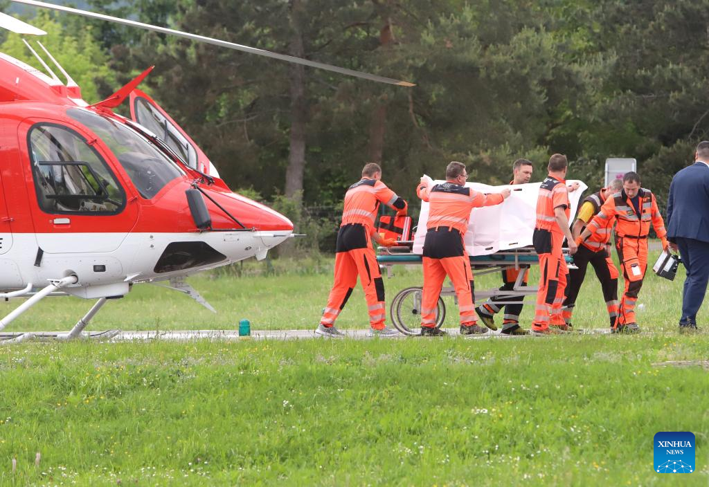Rescuers transfer wounded Slovak Prime Minister Robert Fico from a helicopter to a hospital in Banska Bystrica, Slovakia, on May 15, 2024. The wounded Slovak Prime Minister Robert Fico is still in critical condition and is undergoing surgery, Slovak Deputy Prime Minister and Defence Minister Robert Kalinak said Wednesday evening. The attack has been classified as an assassination, with the gunner firing five shots, according to Slovak Interior Minister Matus Sutaj Estok. He added that the attack was "politically motivated." Fico was wounded Wednesday afternoon after attending a government meeting in the town of Handlova, some 150 km northeast of the capital. (News Agency of the Slovak Republic/Handout via Xinhua)