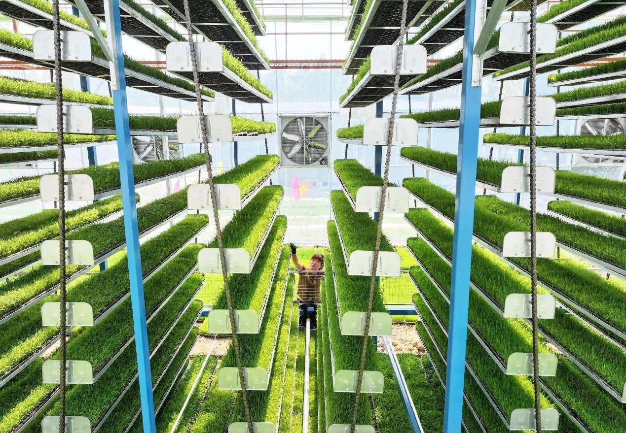 A farmer checks on the growth of rice seedlings in an intelligent sprout cultivation center in Honglai township, Nan'an, southeast China's Fujian province. (People's Daily Online/Zhang Jiuqiang)