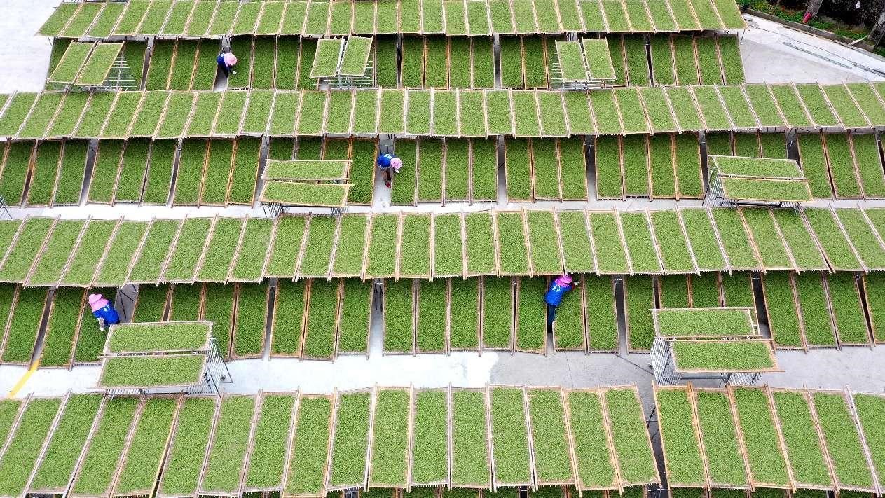 Workers dry tea leaves in Xiaoyue village, Qianqi township, Fuding, southeast China's Fujian province, March 26, 2024. (People's Daily Online/Wang Wangwang)