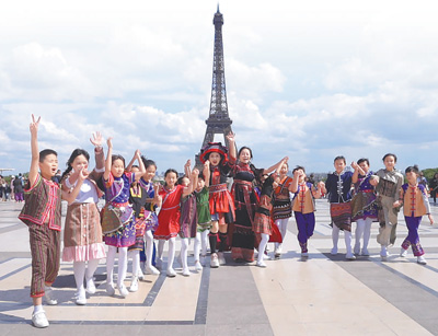 Members of the Li and Miao Ethnic Children's Chorus of Wuzhishan pose for a group photo in front of the Eiffel Tower in Paris, France. (Photo courtesy of the Publicity Department of the Communist Party of China Wuzhishan Municipal Committee)