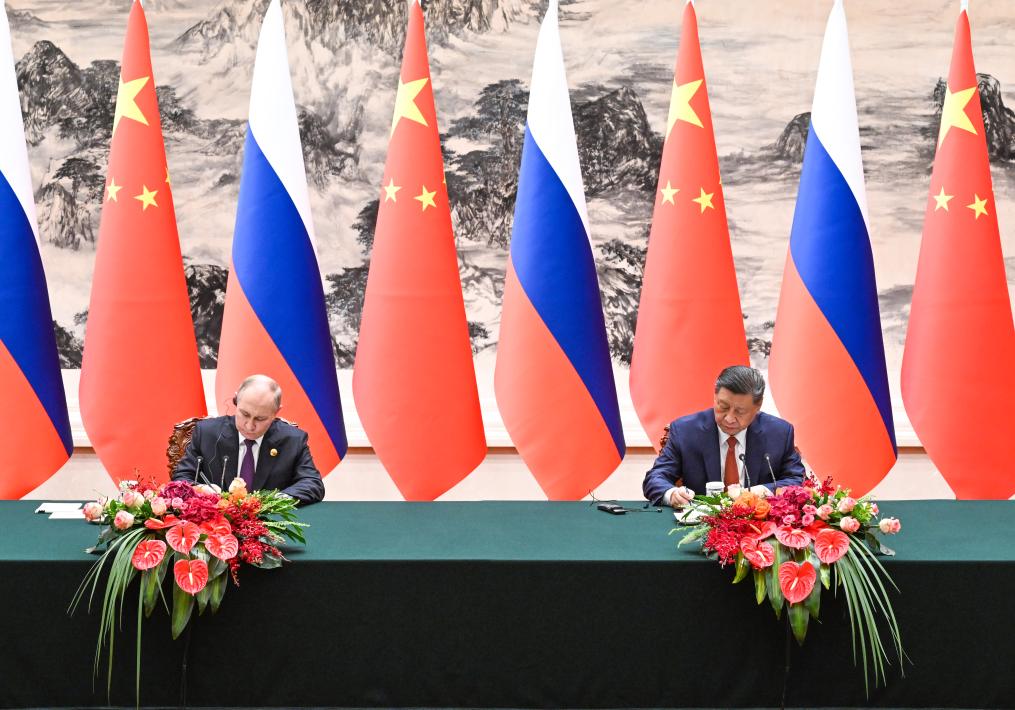 Chinese President Xi Jinping and Russian President Vladimir Putin sign and issue a joint statement on deepening China-Russia comprehensive strategic partnership of coordination for a new era on the occasion of the 75th anniversary of the establishment of diplomatic ties between the two countries after their talks in Beijing, capital of China, May 16, 2024. Xi held talks with Putin, who is in China on a state visit, at the Great Hall of the People in Beijing on Thursday. (Xinhua/Rao Aimin)