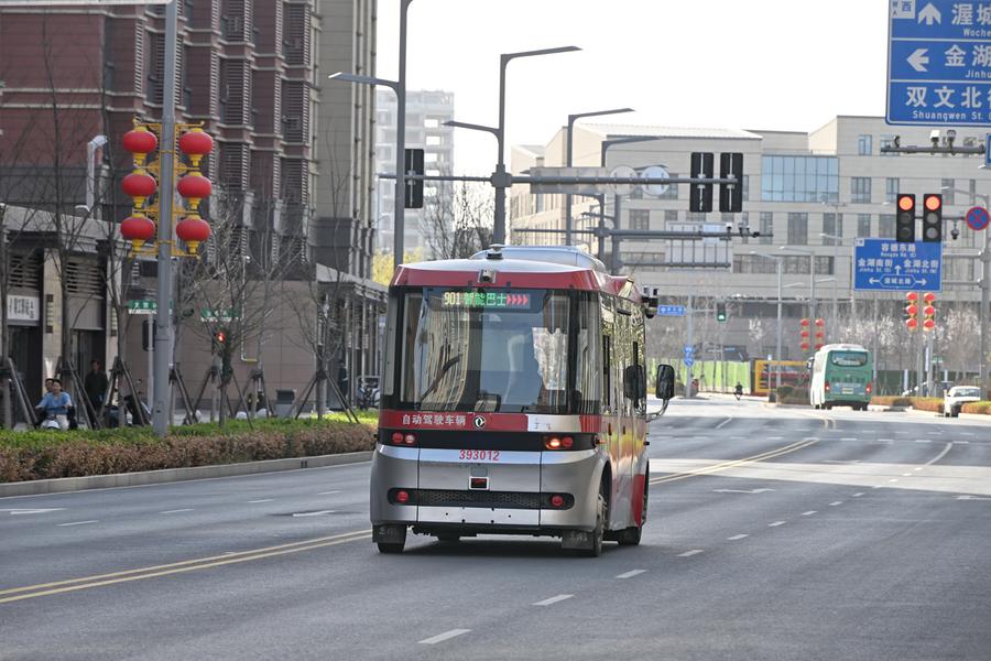An intelligent connected bus runs on a road in Rongdong area of Xiong'an New Area, north China's Hebei Province, March 29, 2024. The new area aims to relieve Beijing of non-essential functions related to its status as the nation's capital, while also advancing the coordinated development of the Beijing-Tianjin-Hebei region. (Xinhua/Mu Yu)